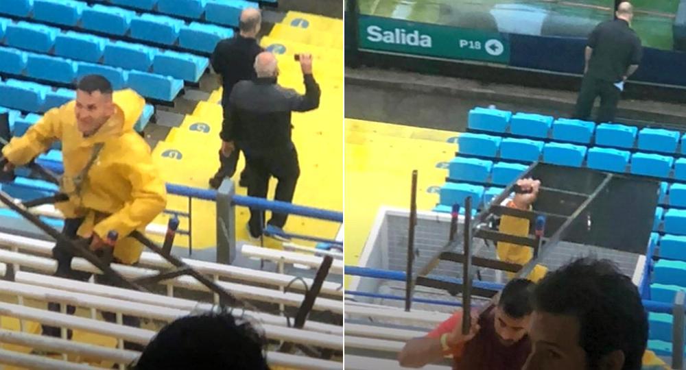 Una estructura de hierro tipo escalera que se utiliza para la transmisión de televisión cayó al sector de plateas bajas en medio de la incesante lluvia.