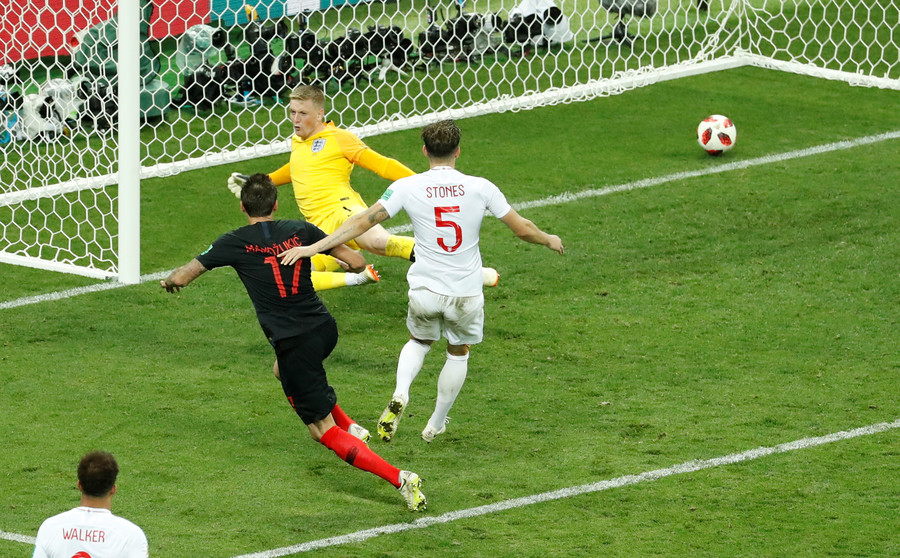 Al final de la primera mitad del tiempo extra Perisic fue liberado por la izquierda, su bola encontró a Kramaric pero su disparo fue despejado. Luego, los corazones ingleses se quedaron boquiabiertos cuando Mandzukic quedó libre en la zona, pero su toque de gol se desvió de Pickford en toda su extensión, aunque la colisión inevitable e inevitable forzó al delantero a quedarse abajo para recibir tratamiento.