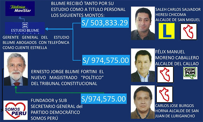 Entre 2008 y 2016, Ernesto Blume recibió más de 1 millón 753 mil soles por los servicios prestados a la gestión de Flex Moreno; 544,998 soles por servicios a la gestión de Salvador Heresi, y 640,500 soles en la gestión de Carlos Burgos.