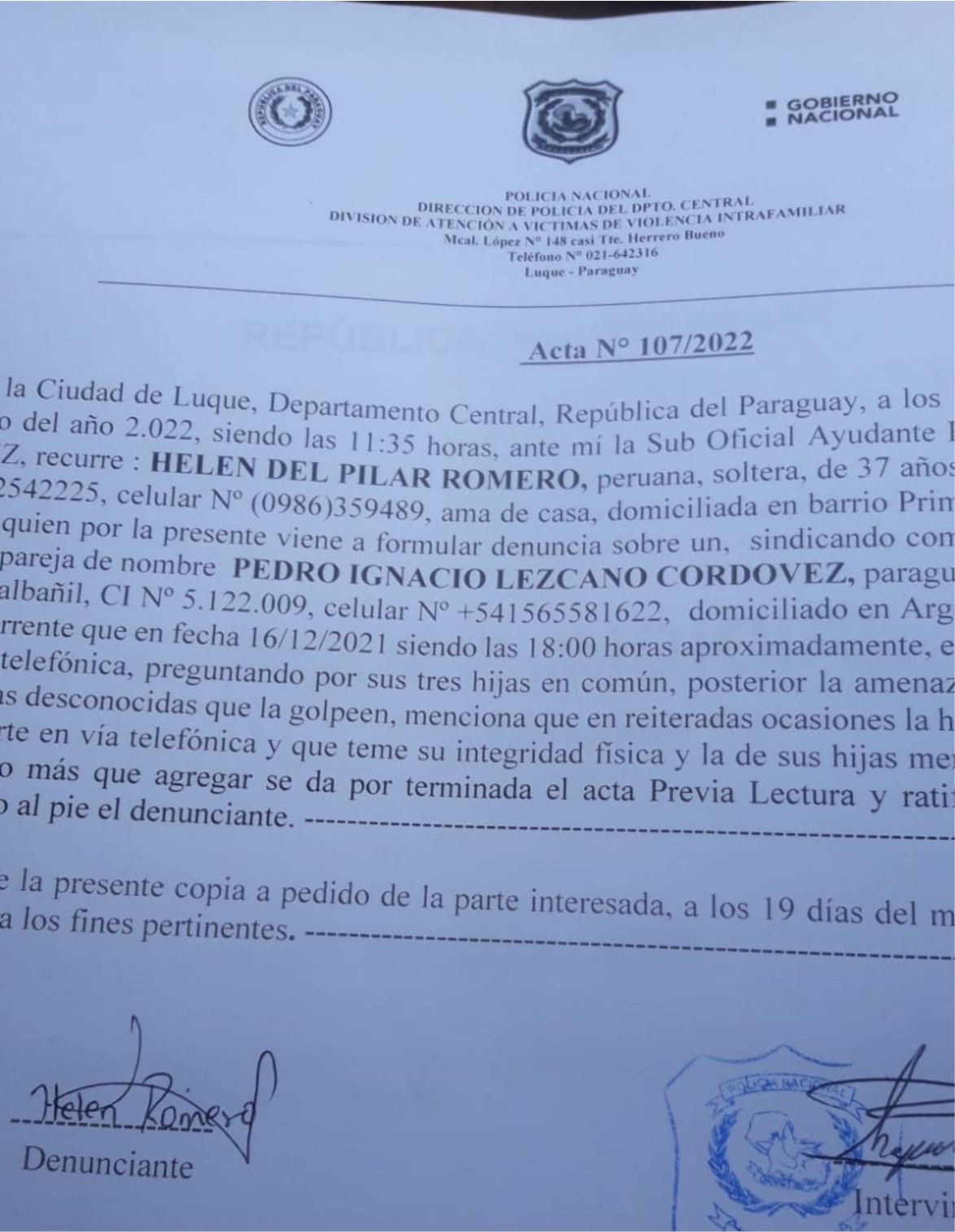 Según la última denuncia policial, Helen Romero, vendría sufriendo reiteradas amenazas telefónicas por parte de su ex cónyuge Pedro Ignacio lezcano Cordobeza y allegados a este, exigiéndole que trajera a sus hijos a Buenos Aires, a donde fugó luego que en marzo del 2018 el Juzgado Penal de Garantías Nro. 2 de la VI circunscripción del Alto Paraná, lo declarara en rebeldía y ordenara su captura para responder por los cargos de «COACCIÓN SEXUAL Y VIOLACIÓN, ABUSO SEXUAL EN NIÑOS Y VIOLENECIA FAMILAR».