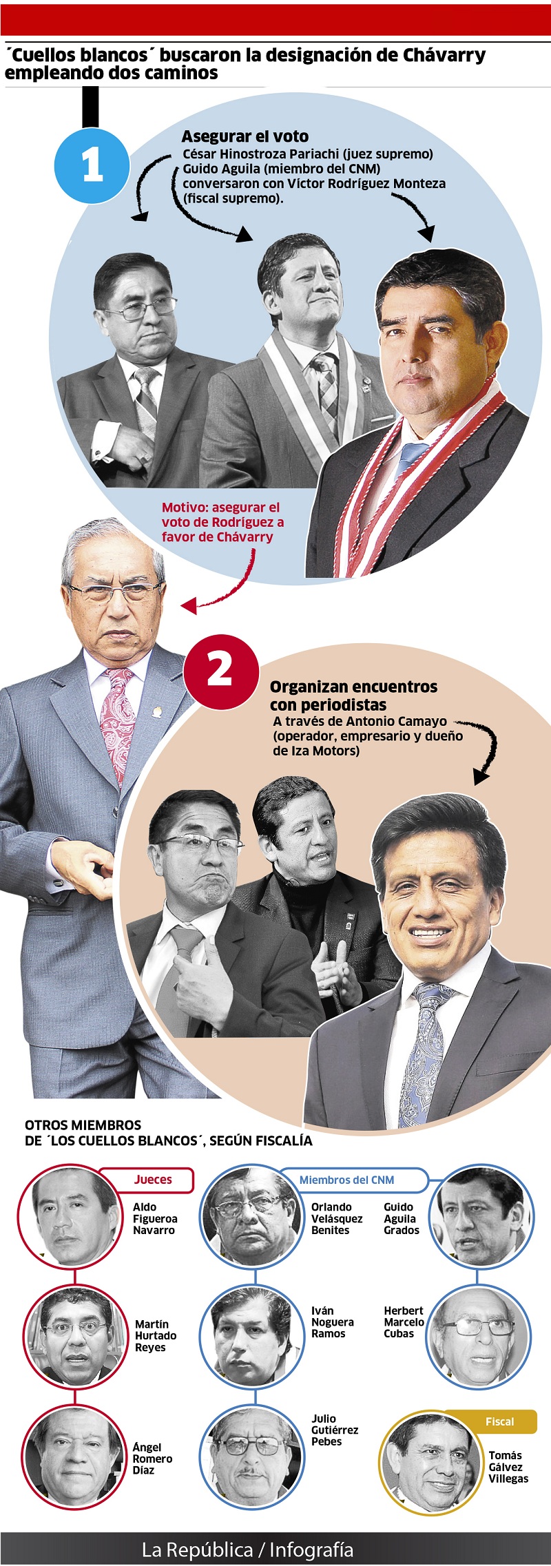 Para asegurar la elección de Chávarry, el hoy suspendido juez César Hinostroza y el exmiembro del Consejo Nacional de la Magistratura (CNM) Guido Aguila conversaron con el fiscal supremo Víctor Rodríguez Monteza, con derecho a voto en la elección, detalló el colaborador de la Fiscalía. Además, planearon organizar encuentros con periodistas para limpiar la imagen pública de Chávarry mediante “entrevistas de apoyo dirigidas”. Para ello contaron con el empresario Antonio Camayo, dueño de Iza Motors y hoy con prisión preventiva.