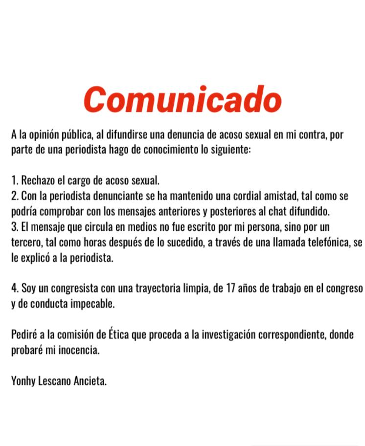 Además, a través de sus redes sociales el congresista Yonhy Lescano emitió un comunicado: