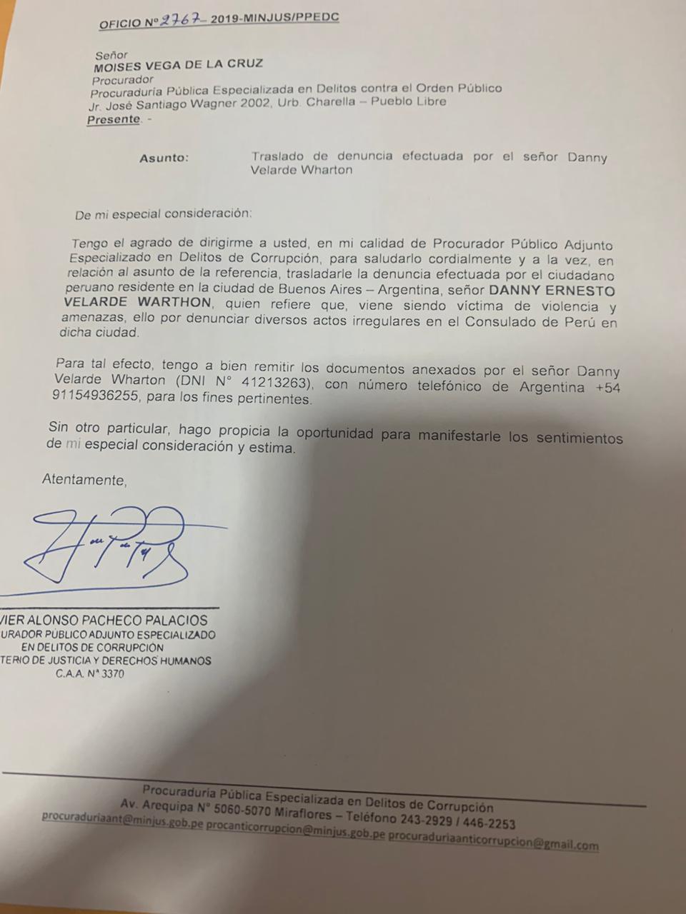 “Trasladarle la denuncia efectuada por el ciudadano peruano residente en la ciudad de Buenos Aires-Argentina señor Dany Ernesto Velarde Wharton. Quien refiere que en el consulado del Perú en dicha ciudad existiría una organización criminal Aparentemente liderada por el cónsul Carlos Vallejo Matell”. Dice la misiva dirigida al Fiscal coordinador de las Fiscalías contra el Crimen Organizado, Jorge Chávez Cotrina.